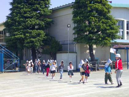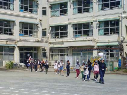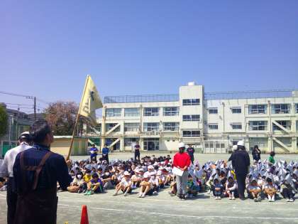 今日は今年度最初の避難訓練を行いました。校舎西側の近隣民家火災の想定です。1年生は最初なので校庭で見学。2年生から6年生までが真剣に避難する様子は、1年生のよいお手本となりました。命を守る訓練をこれからも続けていきます。