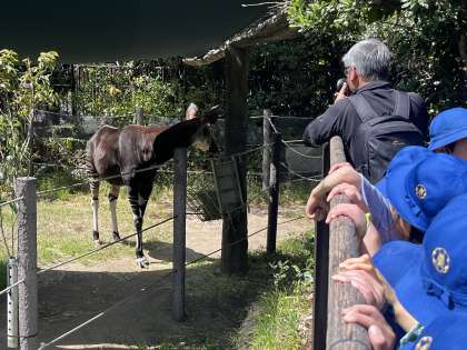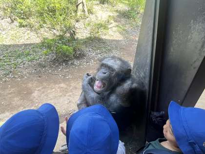 午後は、オカピやチンパンジーとご対面。そして、元気な人は広場で遊びました。バス出発しました。予定どおりです。