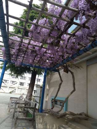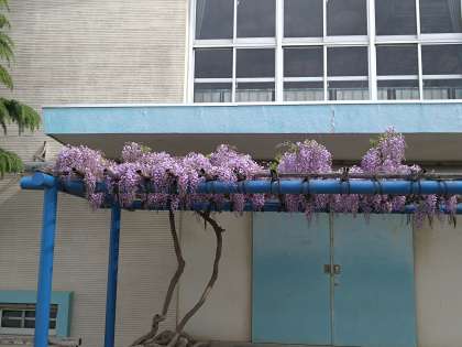 桜の花が散った中、藤の花がきれいに咲いています。 副校長