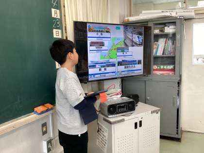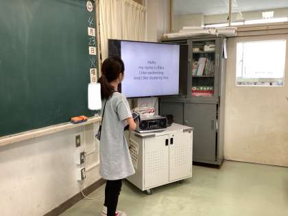 5年生の外国語の学習では、英語に関する自主学習をしたらクラスで共有する時間を設けています。