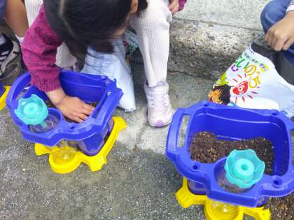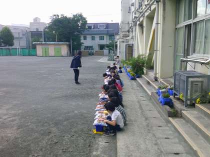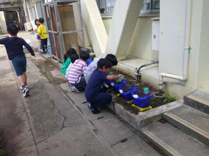 雨もあがり、気持ちがよい天気となりました。1年生は生活科の学習で「アサガオ」を育てますが、今日はその準備として、土づくりをしました。植木鉢に土と肥料を混ぜ入れ、湿らせて、いつでも種まきができるようにしました。