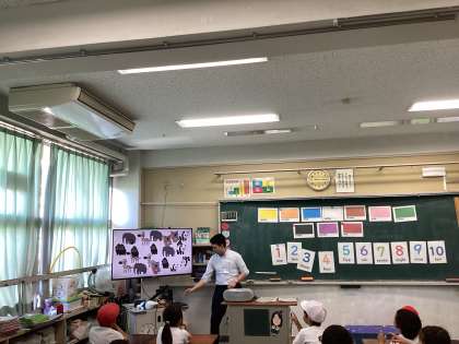 1〜10の数を外国語の先生と一緒に発音しながら、「How many~」クイズをしました。前回学習した動物の数を数えました。