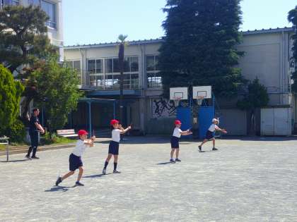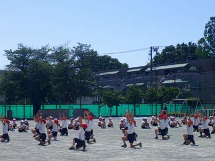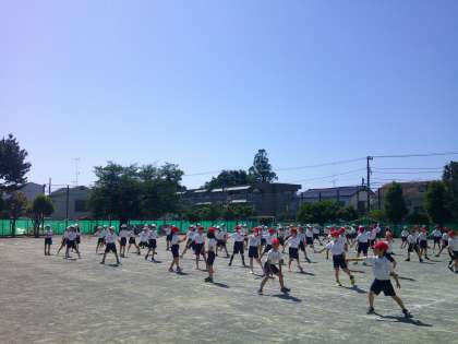 4年生の運動会の表現運動は「エイサー」です。各クラスの実行委員の子どもたちが全体練習をリードしています。「イーヤーサーサー」の元気なフェーシの声が響きました。パーランクーをもった練習が待ち遠しいですね。