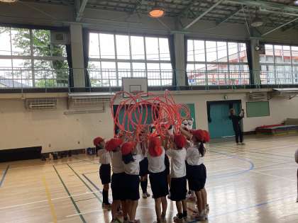 今日は、先週の振り返りを行い、クラス赤白ごとにフラフープを重ねたり、離したりする技に挑戦しました。