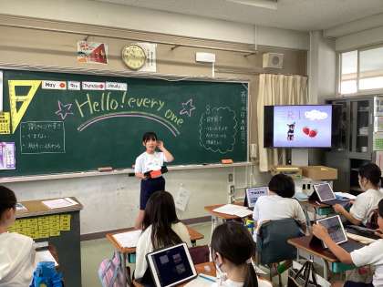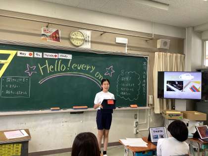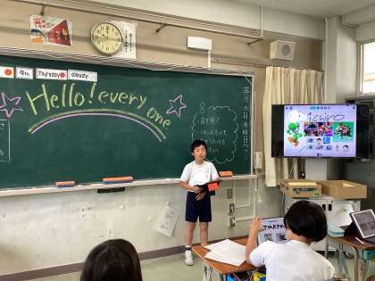 5年生の英語の学習では自己紹介のスピーチを行っていました。自分の名前、自分の好きなことを書いたスライドを見せながら、前を向いてスピーチができるように頑張っていました。自分の名前の綴りを発表している子もいて、聞き手にわかりやすいスピーチを心がける姿が素晴らしかったです。