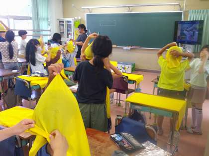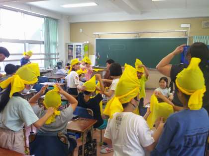 来週運動会を迎える等々力小学校。今日は、表現運動「エイサー」の衣装、サージを巻く練習をしました。みんな当日へ向けてワクワクしていました。