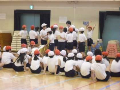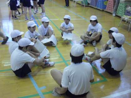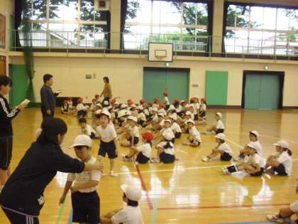 はじめての練習日。残念ながら雨だったため、体育館での指導となりました。名簿が配られ、チーム毎に自己紹介し、ゼッケンやハチマキの説明を受けました。