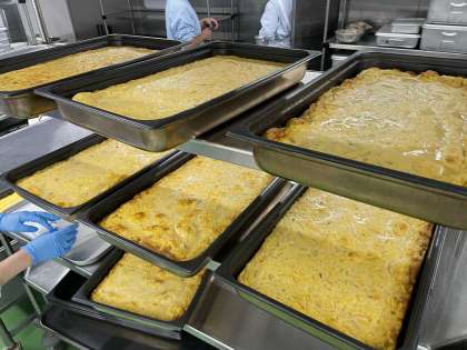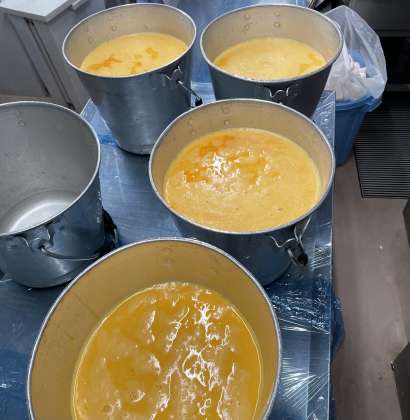 スパニッシュオムレツは、じゃがいもや玉ねぎ、ベーコンを炒めて卵と混ぜ合わせて焼きました。等々力小学校全員分のオムレツを作るために使った卵の数は、なんと700個近くになります。一つ一つリズミカルにパカッパカッと割ってほぐしています。果物は、美生柑(みしょうかん)でした。酸っぱい味のもとになる「クエン酸」は疲労回復を助けてくれると言われています。