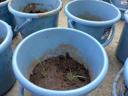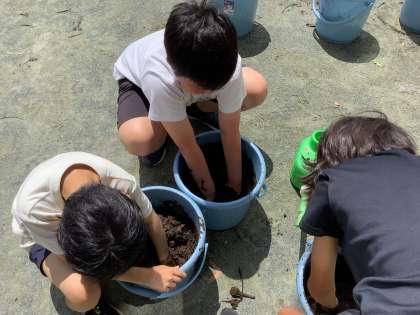 5月29日(水)、5年生は稲植えを行いました。1時間目には、オンラインで雁音米農家の小野寺さんからお話を聞きました。雁音米の由来、宮城県の田んぼの様子、いい土の作り方などを教えていただきました。2・3時間目には、ビオトープギルドさんたちに教えてもらいながら、今までパックで育てていた稲をバケツに植え替え、肥料を入れたり水の量を調整したりしました。これから、どんな風に稲が成長していくのか楽しみです。