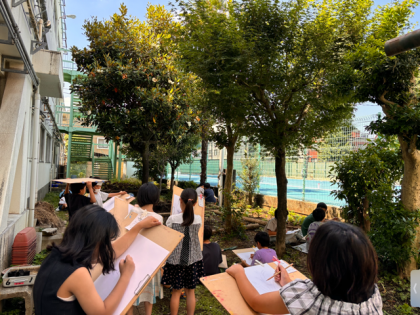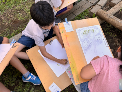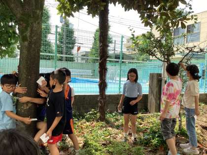 今週から4年生は図工室の外に出て、木をスケッチする活動に取り組んでいます。五感を使って木と触れ合ってお気に入りの木を見つけ、感じたままに絵に表しています。「あったらいいな」と思うものを足してみたり、その場にある土や葉っぱを使って描いてみたりと、思いのままに楽しく活動していました。