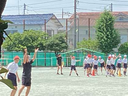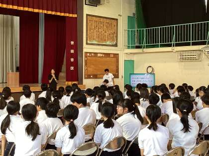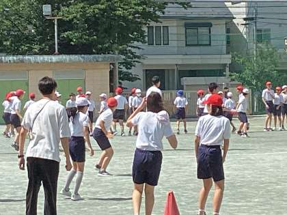 新谷選手がマラソン選手になったきっかけや、試合に向けた心構え、普段の生活の様子をお話しいただいた後、鷲見コーチに校庭でトレーニングをしていただきました。