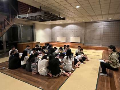 班長会議です。今日一日の振り返りをして明日に生かそうと話し合いました。反省点もありましたが、飯盒炊飯の片付け、ピカピカだった。みんな室長の話を聞いてくれた。声をかけ合えて行動できた。自主的にルール決めて行動していた。などの意見が出ました。明日もっと楽しくなれるとよいですね。