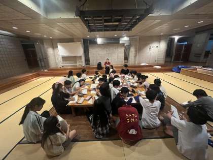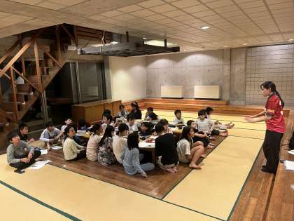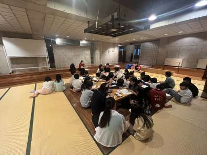 班長会議です。5分前行動、整理整頓、騒ぎすぎなどが昨日より改善したとのことです。忘れ物をしない。荷物を広げ過ぎ。布団で遊んでしまった。などの反省点があがりました。明日来た時よりも美しくを合言葉に頑張るそうです。たくさんのプログラムをみんなで協力できた2日目でした。