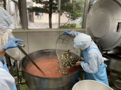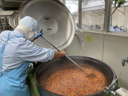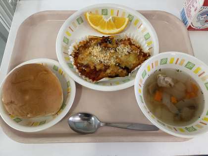 パインパンは、パイナップルの果肉が入ったパンで、甘くて美味しいです。なすのグラタンは、ミートソースに油で揚げたなす、茹でたペンネを合わせて、チーズとパン粉をのせてオーブンで焼きました。
