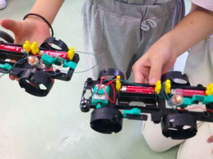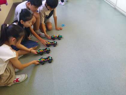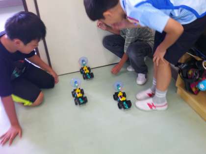乾電池1個の時、2個の直列つなぎや並列つなぎの時の電流量とモーターの回る速さの関係を理解してきた子どもたち。今日は分かったことを活用しておもちゃを組み立てみんなで遊びました。なかなか電気を使ったおもちゃに触れたことのないも多いので、みんなで教え合っていました。中には回路を工夫して豆電球を点けながら走るオリジナルカーにしている子いて素晴らしかったです。