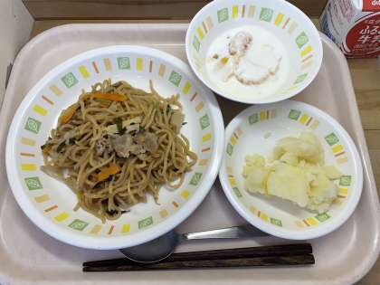 焼きそばは、ソースではなく塩で味付けをしました。野菜やお肉など具材の旨みが引き立って美味しく仕上がりました。じゃがいもは茹でてから、塩こしょう、バターを絡めて味付けをしました。フルーツヨーグルトは、プレーンヨーグルトとフルーツ缶の黄桃、みかん、パイナップルを合わせました。4年生や3年生のクラスでは、今日は全部おかわりする‼︎という声が聞こえたり、おかわりの行列が出来ていました。