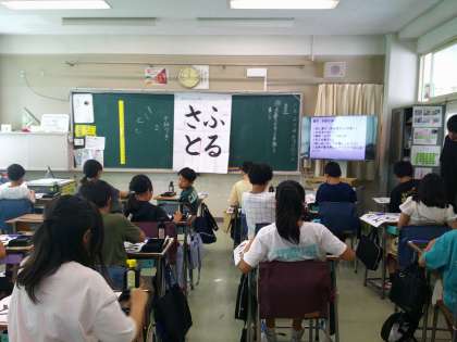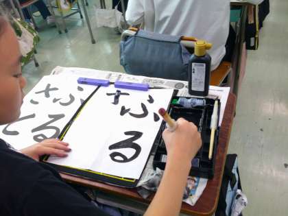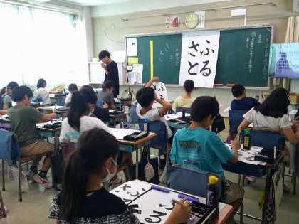 お手本をしっかりと見て、筆をならし、丁寧に「ふるさと」を書きました。毛筆でひらがなを書くのは難しいですが、みんな上手に筆を運んで書いていました。とても集中して取り組んでいて素晴らしいです。