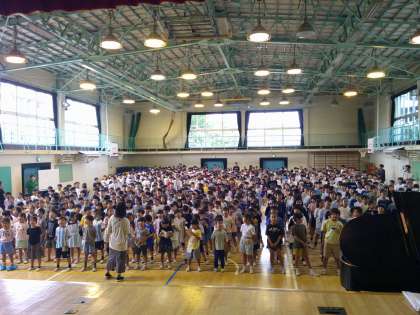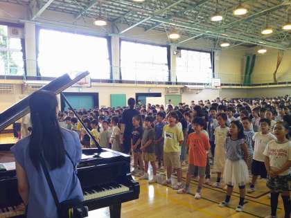 今朝は、音楽朝会です。「世界がひとつになるまで」を全校児童で合唱しました。2番は5・6年生が別のパートを歌いました。運動会の時に歌った、ゴーゴーゴーも元気いっぱいで素晴らしかったですが、今日は音程も声の出し方もバッチリで、美しい2部合唱となりました。
