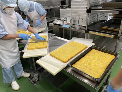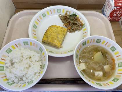 卵焼きは、ひき肉や切り干し大根を炒めて柔らかくなるまで煮てから味付けをして、溶き卵と合わせて焼きました。田舎汁は、具沢山の野菜たっぷり味噌汁です。ごま酢和えは、すりごまたっぷりでとっても美味しく出来上がりました。