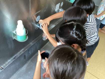「水筒の中に入る水のかさはどれくらいでしょう。」という問題から、実際に水を入れて測ってみました。まず、予想をするときに「入れ物の大きさを同じにしないと比べられないね。」という発想から1デシリットル何個分になるか考え、水を入れました。体験することによって、理解が深まりますね。