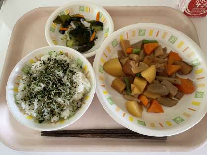 今日は和食の献立でした。和食の日は、残ってしまうことが多いです。今日の煮物も鶏肉やさつま揚げ、野菜の旨みがギュッと詰まって、味も染みて、彩もきれいに美味しく仕上がりました。1年生のクラスでは、ごはんとふりかけのおかわりの行列が出来ていて、たくさん食べてくれていました。和食も美味しく食べられるように作っているので、ぜひチャレンジして食べてほしいと思います。