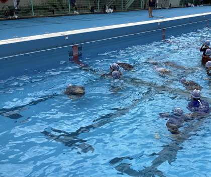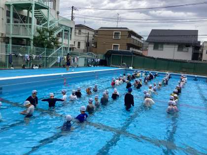 命を守る大切な学習です。長袖を着て水の中で動いてみると、足がつく深さでもとても動きづらいことがわかりました。身体の力を抜いてクラゲのように浮くことや、着ている服に空気を含んで浮き輪の代わりにして浮かぶ練習をしました。