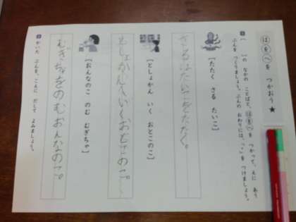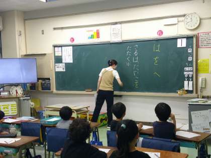 ひらがなの学習を終えた1年生。今日は助詞の中の「は」「を」「へ」を使って分を作りました。1学期でたくさんのことができるようになって素晴らしいですね。