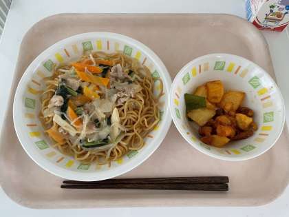 ケチャップ和えは、じゃがいも、ピーマン、大豆を素揚げして、鶏肉は下味をつけて片栗粉をまぶして油で揚げてから、ケチャップ味のソースで絡めて作りました。彩がきれいに仕上がりました。