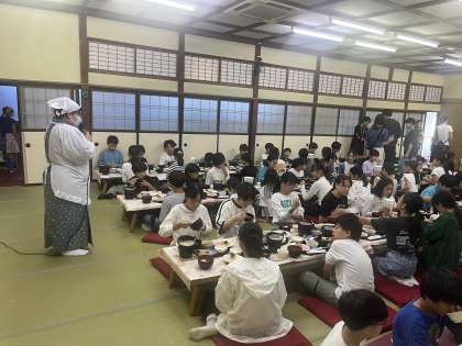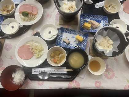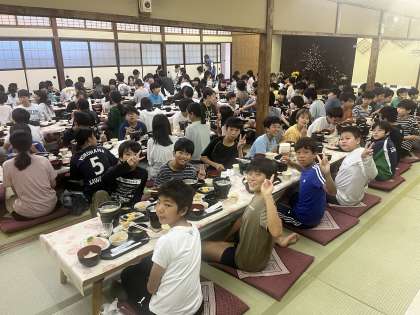 2日目の朝食です。ご飯をおかわりする子もたくさんいます。梅屋敷の皆さん、美味しい朝食をありがとうございます。
