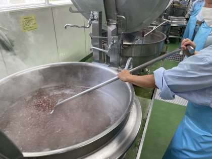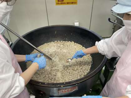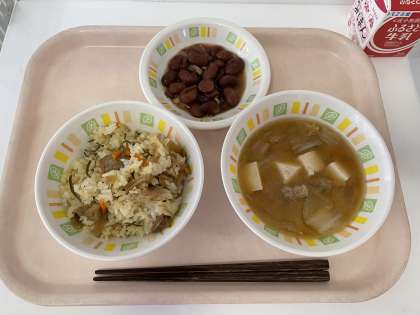 いわしのつみれ汁は、いわしのすり身とタラのすり身を混ぜ合わせて、しょうが、ねぎ、みそ、しょうゆ、片栗粉を混ぜ合わせて、つみれを作りました。だし汁の中に、摘み入れるので、「つみれ」と言われています。つみれの旨み、野菜の旨み、がだし汁と合わさって、とても美味しく出来上がりました。煮豆は、1時間浸水して、下茹でに1時間半、調味料を加えて1時間コトコト煮て、しっとりホクホクで美味しいお豆に仕上がりました。苦手な人もいますが、甘くておいしく出来上がったので、どのクラスもよく食べてくれました。