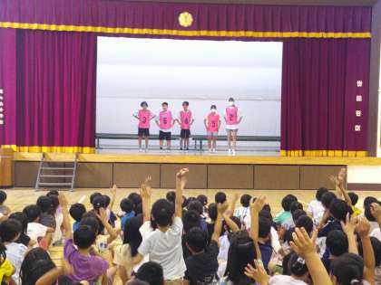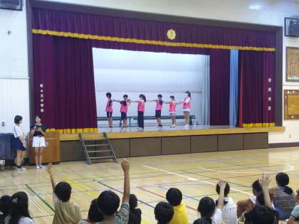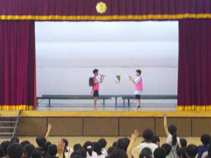 今日の集会は2、4、6年。「間違い探し」をしました。「open the door」と叫ぶと、幕が開いて集会委員会のみなさんが、いろいろな格好とポーズをしています。「close the door」と叫び、再び幕が開くと、違う格好になっていたり、ポーズが違ったりします。みんなよく見ていて違いを発見していました。面白いポーズをしたり、段取りよく進めたり、みんな楽しく参加できました。集会委員会のみなさんありがとうございました。