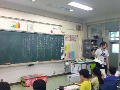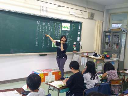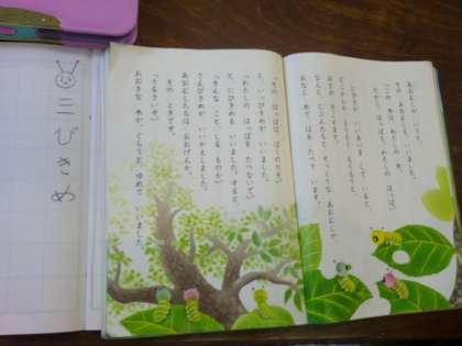 1年生は今、こかぜ さち作 物語「やくそく」をもとに学習しています。登場するアオムシさんの感情を表す「イカリメーター」などを使って、読み深めています。その登場人物の気持ちをもとに音読を工夫していきます。みんな楽しそうに学習しています。