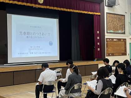 学校からの報告と共に、内科、眼科、歯科、薬剤師の4名の学校医の先生方にご来校いただき、健康診断の結果をもとにしたお話や、専門的なお立場から健康に関するアドバイスをいただきました。ご講演は、日本体育大学スポーツ教育学部准教授 宇部 弘子先生をお招きし『思春期とのつきあい方〜親の色と子どものいろ〜』をテーマにお話しいただきました。関わる大人が子どもたちにどう接してどう声をかけるとよいのか。やりたいこととできることの矛盾と戦っていること。自分が自分らしくなることがこころを満たす。かかわりのテクニックなど、思春期前の子どもの特性から、思春期の子の身体とこころの変化について、たくさんのお話をいただきました。学校医の先生方、宇部先生、ご参加いただきました保護者の皆様本当にありがとうございました。