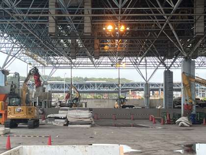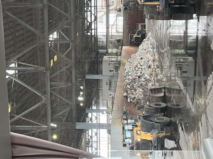 埋め立て処分場にいく前に中間処理施設を車窓から見学です。布団は毎日平均3000枚処理しているそうです。中間処理をすることがゴミを減らす大切なことと教えていただきました。