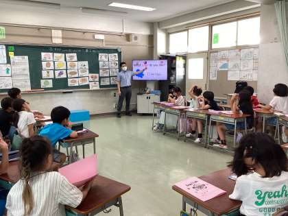 3、4年生になると週に一度、外国人講師による外国語の学習が行われます。今日は3年生で、好きな色、好きな食べ物、好きなスポーツについて質問する学習をしていました。「 Who am I ?」クイズを行う中で、楽しみながら「好きな色(食べ物、スポーツ)はなんですか?」と尋ねることができました。