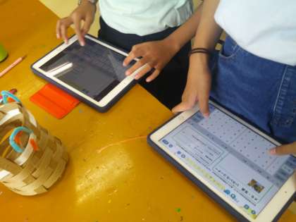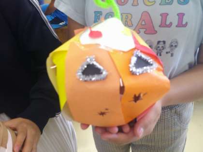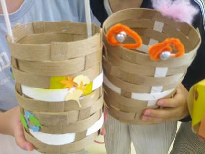 「つないで 組んで すてきな形」という題材で作品を作りました。紙バンドなどを使っての作品作りです。上手に編み上げ、かごを作ったり、かぶるものを作ったり、すてきな作品ができました。みんな完成したので、友達の作品を鑑賞し、その感想をロイロノートを使って共有しました。