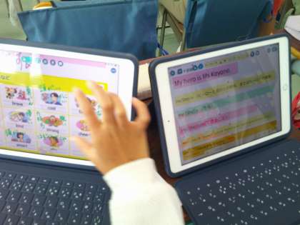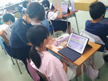 今回の授業の課題は「自分のことをよく知ってもらうために、My heroを紹介するスピーチを考えよう」です。先生自身が尊敬する方の例示をして、子どもたちが考えていきました。 My Mother, Fatherと答える子も多く、すてきな親子関係だと思いました。また、昨年度まで本校で勤務され、今はJICAで活躍している先生がMy heroだという子もいて嬉しくなりました。先生から話型を提示してもらったり、英語が得意な子に教わったり、翻訳アプリも活用しながら、スピーチの英文を作っています。スピーチの本番が楽しみです。