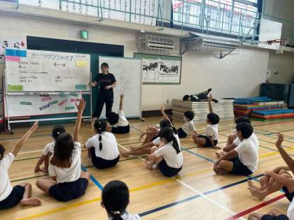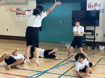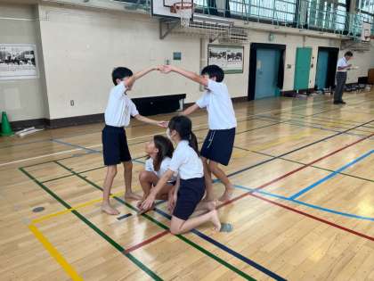 今5年生は表現運動に挑戦しています。どのように動くと、表したいイメージが強調できるか考えながら、みんなで相談して表現しています。今日のお題は「激しい ワクワク料理」です。チャーハンや、ラーメン、てんぷらなど、グループごとに相談してそれらの料理を体を使って表現しました。グループで話し合いながら進めていくのはもちろん、ペアのグループと見合ったり、アドバイスし合ったりして表現運動のめあてが達成できるようにしていきました。何よりも体全体で表現することをみんなで楽しめていて、参観しているこちらも楽しくなりました。