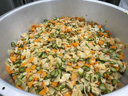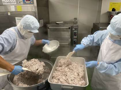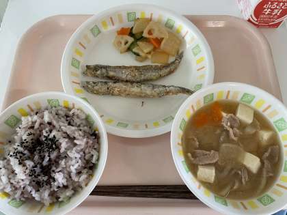 明日は19日で食育の日ですが、土曜日なので、今日は「かむかむ給食」の日になりました。毎月食育の日には、かみごたえのある食材や料理が登場する「かむかむ給食」にしています。今日の古代米ごはんは、黒米を精白米に混ぜて炊きました。黒米は、古代から栽培されて食べられてきたお米で、もちごめの仲間なので、プチッとモチっとして美味しいお米です。骨ごと丸ごと食べられるししゃもは、唐揚げのように、油で揚げました。シャキシャキ野菜は、大根、蓮根、きゅうり、人参を食感が残るようにさっと茹でて仕上げました。蓮根のシャキシャキと、生姜の効いた酢醤油タレの味付けで、美味しく出来上がりました。