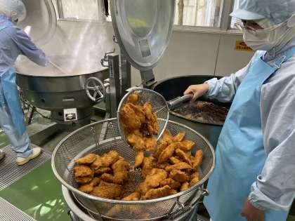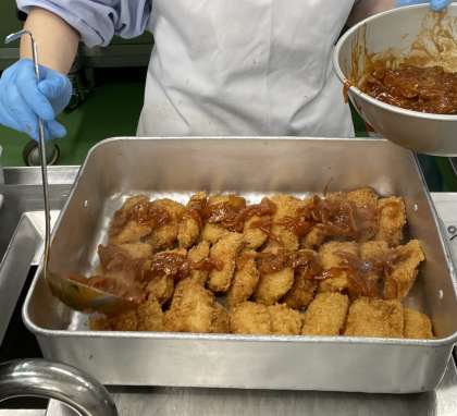 今週は読書週間ということで、図書コラボ給食が登場します。1日目の今日は、「不思議駄菓子屋 銭天堂」の「底なしイ〜カ」というお話とコラボして、イカフライのマッシュルームソースかけを作りました。底なしイ〜カは、スルメのような駄菓子でしたが、給食では、美味しいソースをかけたイカフライにしました。ゆっくりよく噛んで、美味しく味わう時間を長く楽しんでもらえたらいいなと思います。