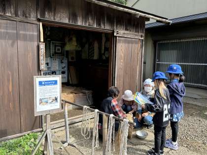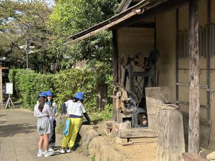 昔の道具を見たり、藍染のやり方を教えてもらったりしています。記念写真も撮りました。