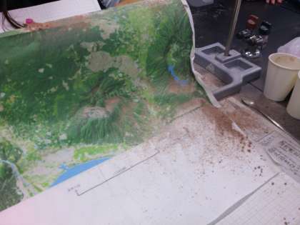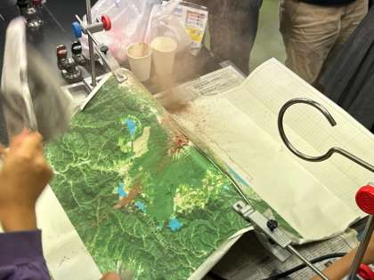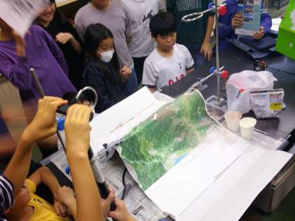 地層のでき方を学習している6年生。今日は火山の噴火によってどのように地層ができていくのか、モデル実験をしました。ストローにココアや粉ミルクを詰めて、空気入れを使って空気を一気に吹き出すと、それぞれの粉が火山灰のように吹き出します。地図上に積もり噴火により地層ができていく様子を再現する実験ができました。「実際に日本で噴火すると、偏西風が吹いているから、地図の西側から風を送ってみよう」と考えていたのが素晴らしいです。