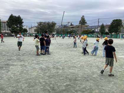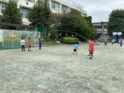 運動委員会さんが企画した、大縄大会(各クラスで1回目の記録を2回目に超えることが目標)がきっかけとなり、休み時間に大縄をしているクラスが多く見受けられます。校長先生、担任の先生も一緒になって取り組んでいます。スムーズに縄の中に入れる子も増えてきました。