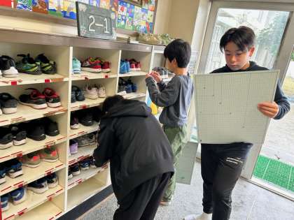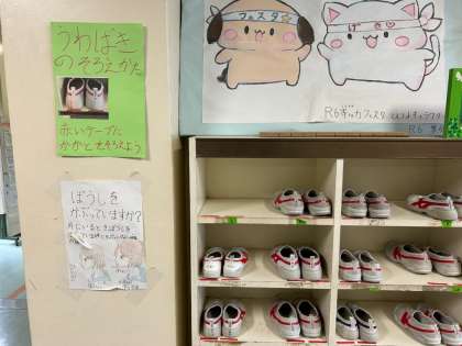 「靴箱にくつをきちんとそろえておいて欲しい。」このことを全校の児童がしっかりとできるように、6年生の有志の子どもたちが活動してくれています。662名全児童の靴箱に赤いテープをはって、ここにそろえてね。と伝えてくれています。先日は給食の放送でも靴箱の靴をそろえること子どもたちに伝えてくれました。この活動が実り、みんながそろえて置き、より整理整頓されたきれいな等々力小学校になっていけるとよいです。6年生のみなさんありがとうございました。
