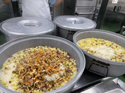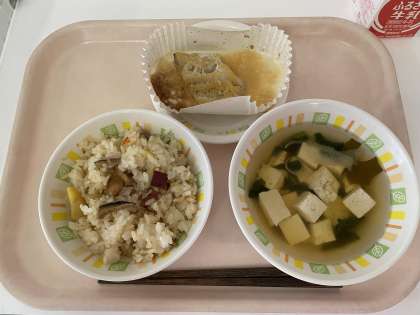 今日は「旬を食べよう給食」の日でした。秋の香りごはんは、さつまいもや栗、しめじなど、秋の味覚を使った混ぜご飯です。油揚げや鶏肉、人参なども合わせて炒め煮した具をごはんと混ぜ合わせました。いろいろな具材の旨みがギュッと合わさって、美味しい混ぜご飯になりました。