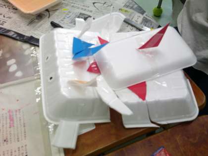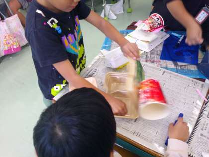 テーマは「ふわっふわっゴー」です。食品トレーなどを使って、乗り物や生き物を作っています。形を作るだけではなく、風で浮くように工夫したり、乗り物の動きを友達と相談しながら作ったりしています。完成が楽しみですね。