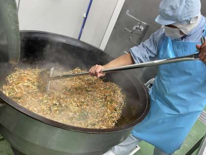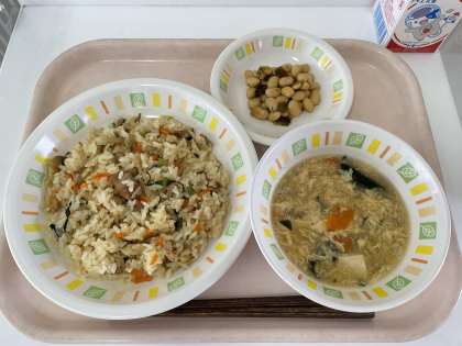 とりめしは、鶏もも肉と、野菜や油揚げ、こんにゃくを炒め煮にして、ごはんと混ぜ合わせて作りました。鶏肉の旨みがしみ込んで美味しいごはんが出来上がりました。こんぶ豆は、大豆と昆布をじっくりコトコト柔らかくなるまで煮ました。甘くて大豆の香りが広がって美味しく出来上がりました。お豆が苦手な子も、一粒チャレンジして、美味しさを発見していました。1年生にはスプーンをつけましたが、お箸を上手に使って食べていました。