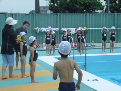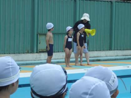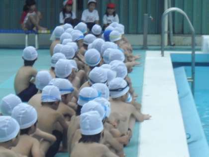 小学校ではじめてのプールの時間でした。注意を聞いて、ちょっと冷たいプールに入りました。