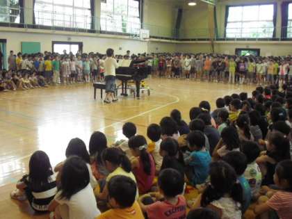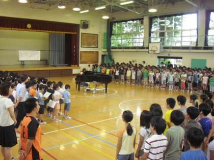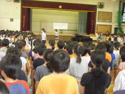 体育館で音楽集会がありました。これまでに低学年だけで音楽集会、高学年だけで音楽集会という機会を設けて、それぞれのパートを練習してきたのですが、今日は、それを合わせて歌いました。曲名は、「南風にのって」です。みんなで歌うのは、今日が最後ですが、それぞれの学級やお友達で歌ってくれたらとお話がありました。