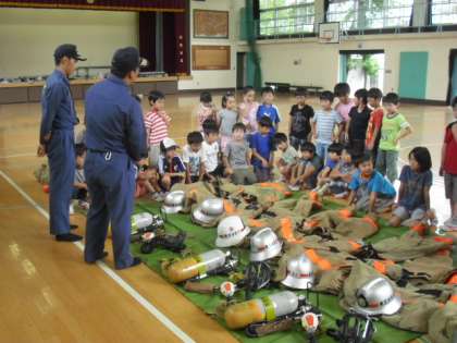 講師として玉川消防署より3人の消防士さんをお招きして、体育館で「消防士になろう」の講座が開かれました。消防士さんの着ている服は、420度まで耐えられると聞いてビックリしていました。